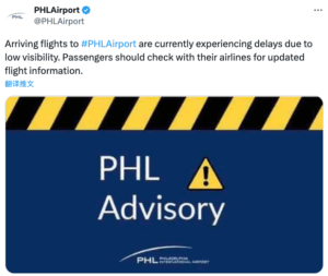 由于空气严重污染,能见度较低。周三(6月7日)下午3点30分,费城国际机场官员发布飞机延误公告。