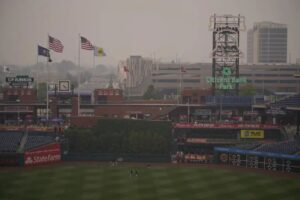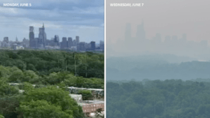 根据美国环保局的数据,由于加拿大大范围野火产生的烟雾,费城的空气质量指数在周三(6月7日)上午突然飙升,并持续了几个小时,达到了”非常不健康”的紫色级别,这是自2008年以来的最高水平。
