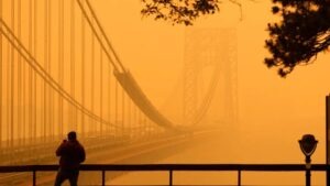 同样广受烟霾影响的还有纽约。受加拿大山火带来的烟雾影响,纽约一度成为全球空气污染最严重的城市。周三下午2时左右,纽约市完全被暗黄色烟霾笼罩,空气里明显的烟味令人不适。