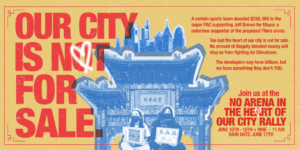 本周六(今日,6月10日),费城市中心将举行一场名为“我们城市中心不需要竞技场”(No Arena in the Heart of Our City)的游行,数条道路也将因此暂时关闭。