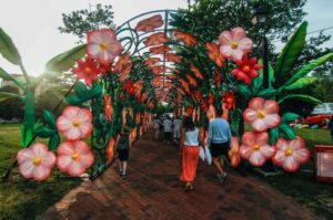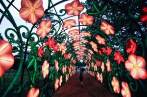 我们回到入口区域准备穿过花隧道时,每个人脸上都洋溢着喜悦和惊叹,但是喷泉旁的樱花树花灯更吸引约翰,于是我们来到了樱花树旁。