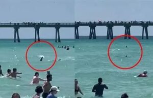 最近,一条鲨鱼就出现在佛罗里达州纳瓦尔海滩(Navarre Beach in Florida)附近的浅水区。它的出现,震惊了游泳者。