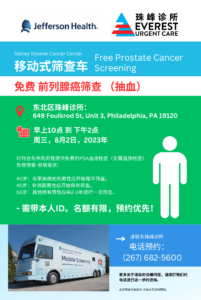 咨询更多信息或者预约免费前列腺癌筛查,请拨打预约电话:(267)682-5600。免费筛查的地址在珠峰医疗东北区诊所,649 Foulkrod St, Unit 3, Philadelphia,邮政编码19120。