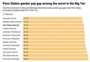 根据联邦综合高等教育数据系统(Integrated Postsecondary Education Data System)的数据,在宾州州立大学的整个系统中,女性教学人员的平均工资约为男性同事的80%,与其他十大联盟大学的旗舰校区相比,属于比较严重的。