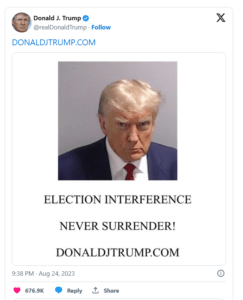 当晚,特朗普还在“X”(原推特)平台发布了其监狱登记照片并配文“干涉选举”和“永不屈服”,同时列出其竞选筹款网站的链接。