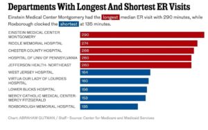 费城地区急诊科室就诊时间最长的是位于东诺里顿镇(East Norriton Township)的爱因斯坦医疗中心蒙哥马利分院(Einstein Medical Center Montgomery),有一半的患者就诊时间超过4小时50分钟。罗克斯伯勒纪念医院(Roxborough Memorial Hospital)则就诊时间最短,平均数据仅为2小时15分钟。