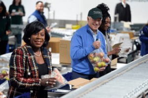 新任费城市长帕克(Cherelle Parker)和拜登一起参加了义工活动。当天上午11点多,两人走进食品包装区,和几十名工人一道,将一袋袋农产品放入传送带上的盒子中。当天,义工们共打包了500盒食品,这些食品将在宾州东南部和新泽西州南部分发。