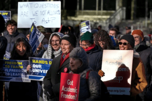 本周一(1月22日),100多名宾大教职员工聚集在白雪皑皑的宾大校园,在范佩尔特图书馆(Van Pelt Library)外,谴责实力雄厚的捐助者马克·罗文(Marc Rowan)对该校的课程施加影响,并敦促学校管理人员捍卫学术自由。