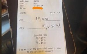 当位于密歇根州(Michigan)一家咖啡馆的服务员得知一位顾客竟然在一张只有32美元的账单上留下了1万美元的小费时,惊呆了!