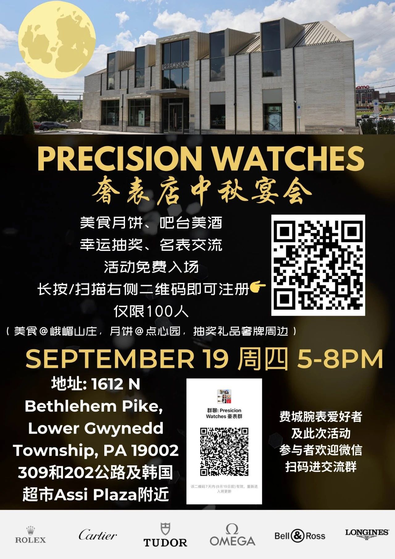 福利时间到!Precision Watches下周四9月19日下午5点至晚上8点将在店内举办中秋宴会邀请大家参加!现场不仅有峨嵋山庄提供的晚餐美食、点心园的月饼,还有大牌周边抽奖,免费入场只需要长按以下海报二维码注册即可参加,给你足够的时间欣赏店内名表以及与手表爱好者交流心得!