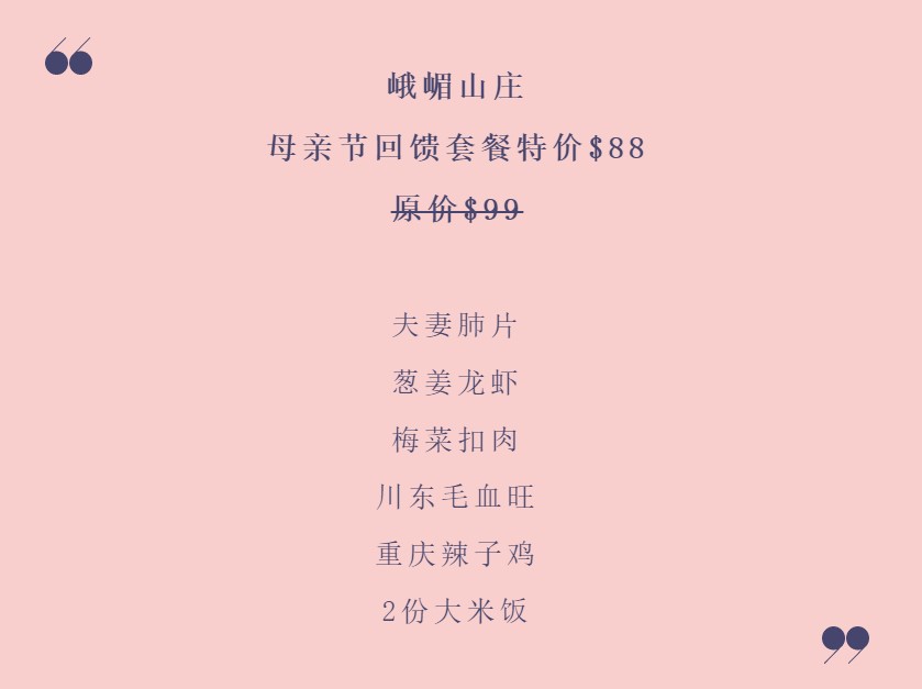 母亲节大餐,想自己亲手做总害怕不够完美?加上华埠峨嵋山庄的美味就不怵了,厨房小白的你搞定简易小炒,峨嵋大厨替你压轴上硬菜,既亲自参与,又能让妈妈吃得开心,完美。