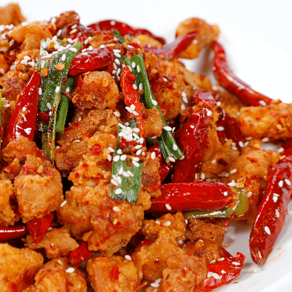 重庆辣子鸡光看干辣椒用量就知道,火辣程度+++++,烧制的鸡肉块外皮脆而不干,肉质嫩而不腻,味道十足的辣。再配上两大份米饭,嗝~这个母亲节满足。