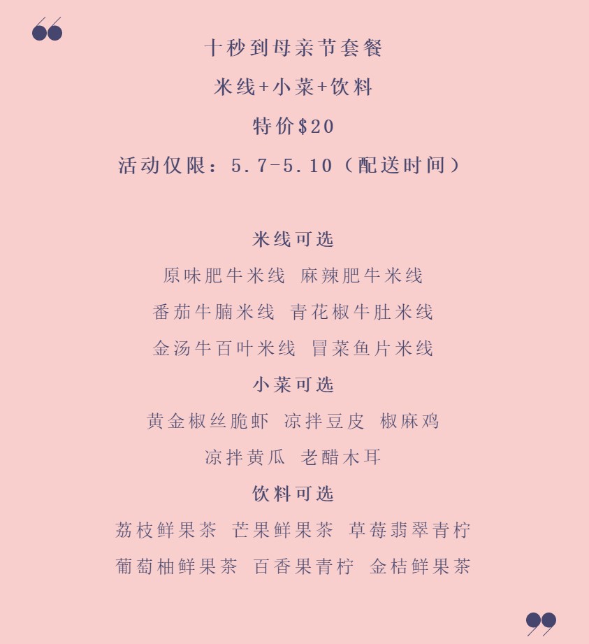 母亲节不只有美味川菜,特价的过桥米线也能一起来一份嘛。让妈妈也尝尝年轻人都爱的美味,十秒到过桥米线是高汤和十种配料的组合,干湿分离打包,运送到家,也能保证米线筋道的口感。
