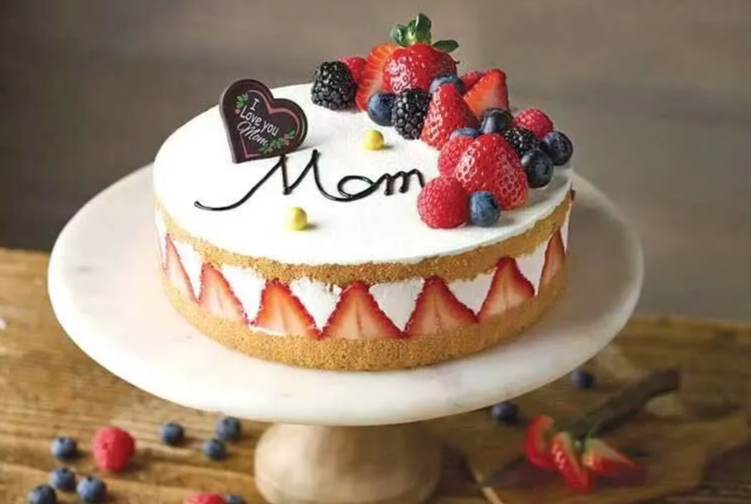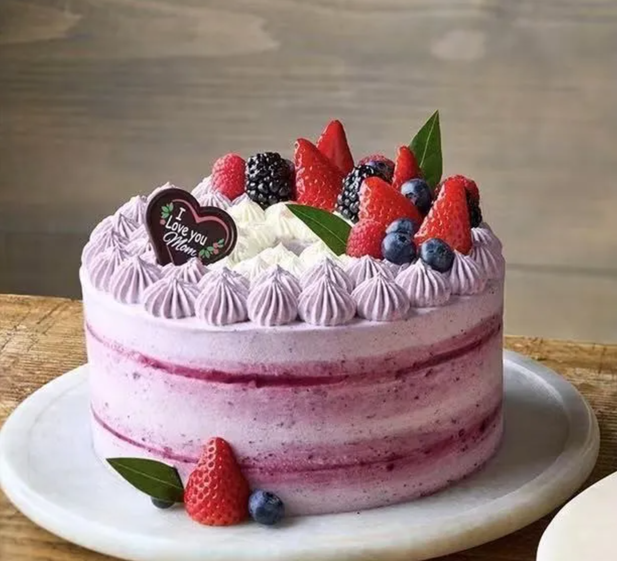 像这款母亲节限定三层莓果蛋糕,整个是热门的香草风味,顶部缀有草莓蓝莓等水果,里面填满软奶油和草莓片,颜值超高又好吃。