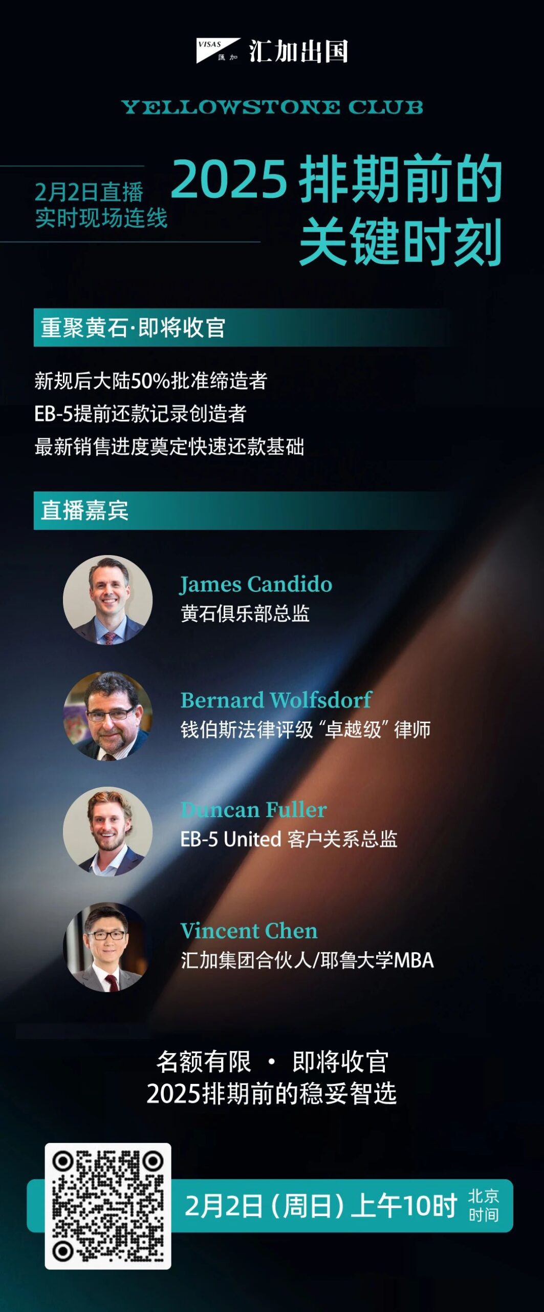 北京时间2月2日(周日),上午10时,业界知名人士将在黄石俱乐部重聚:俱乐部高管将在现场连线分享完美业绩;钱伯斯唯一“卓越级”移民律师将带来2025美国移民排期趋势解读;汇加出国合伙人/ 耶鲁大学MBA Vincent 将在现场分享考察心得并做最新进度汇报。