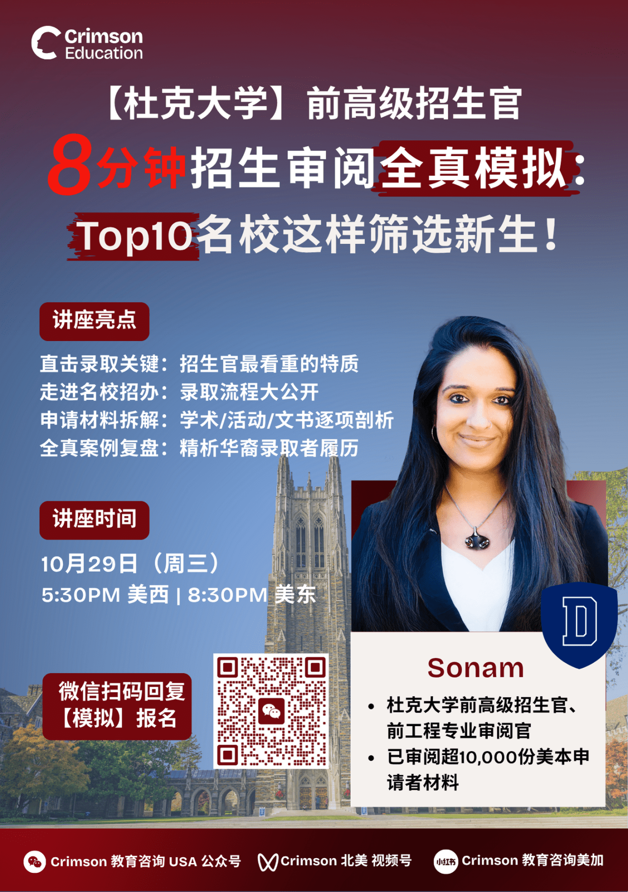 10月29日 (周三) Crimson重磅【8分钟招生审阅全真模拟】邀请「杜克大学前高级招生官」职业生涯已审阅超10,000份申请的Sonam来到直播间,为北美华裔家庭线上亲授「Top 10名校筛选潜规则」:不仅带你现场沉浸式还原一份申请在招生办内部经历的生死旅程+决策机制、通过详细案例实战模拟每个筛选步骤,逐条评估申请人每个赛道的竞争实力,更强势直给针对北美8-11年级学生的精准行动清单,帮助孩子360全维度将自己打造为真正有辨识度、有故事、有影响力的华裔申请人!