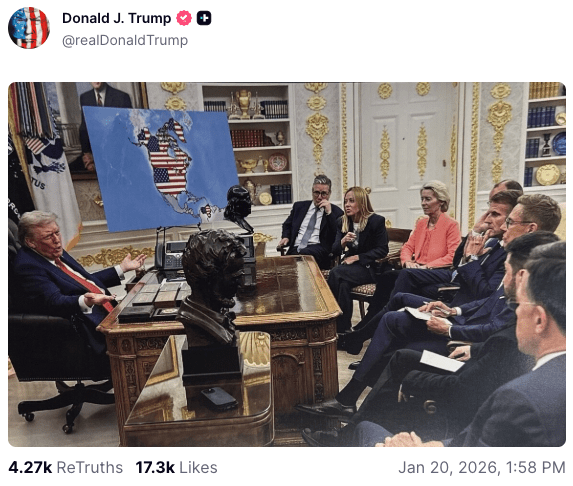周二(1月20日),美国总统特朗普在其社交媒体(truthsocial.com)上发布了两张颇具争议的图片,高调宣称格陵兰岛将在2026年成为美国领土。
