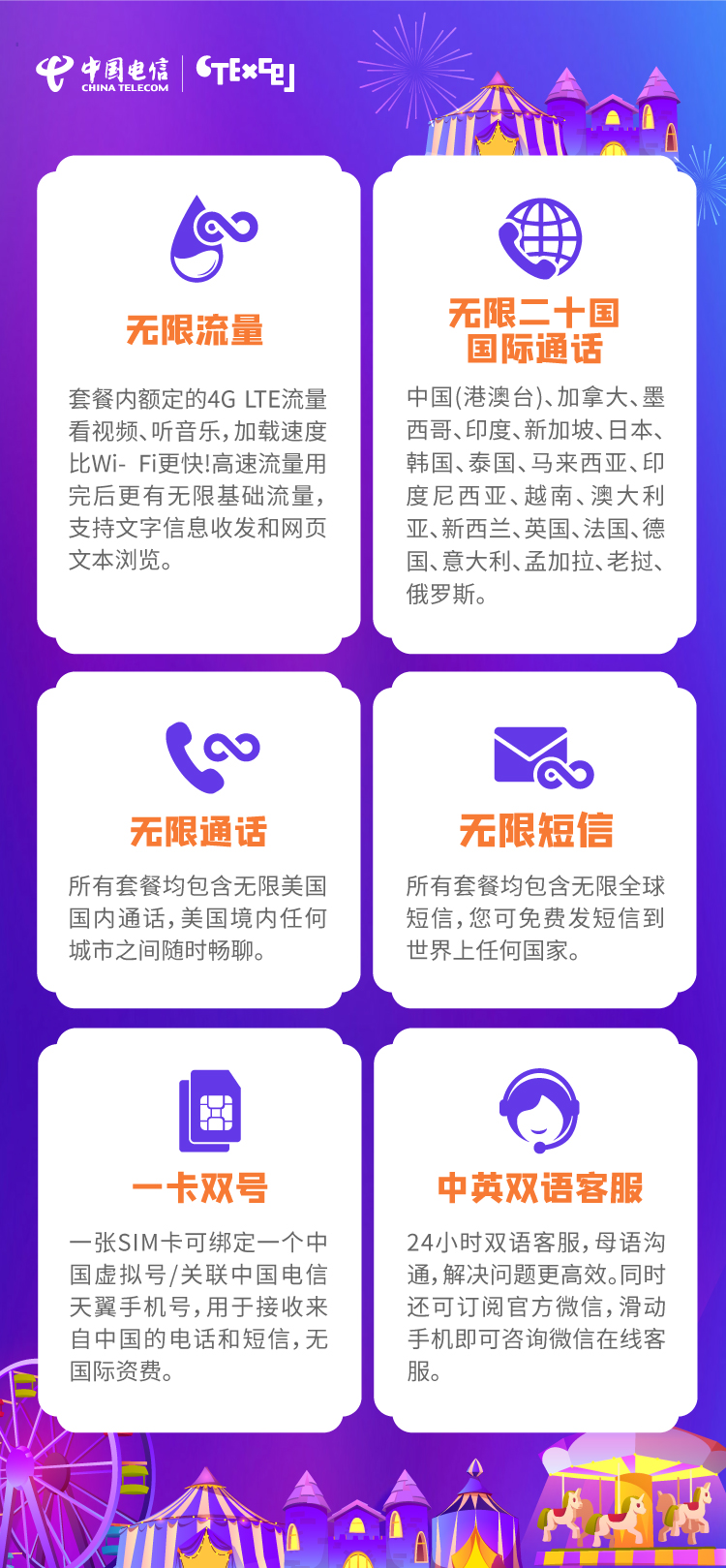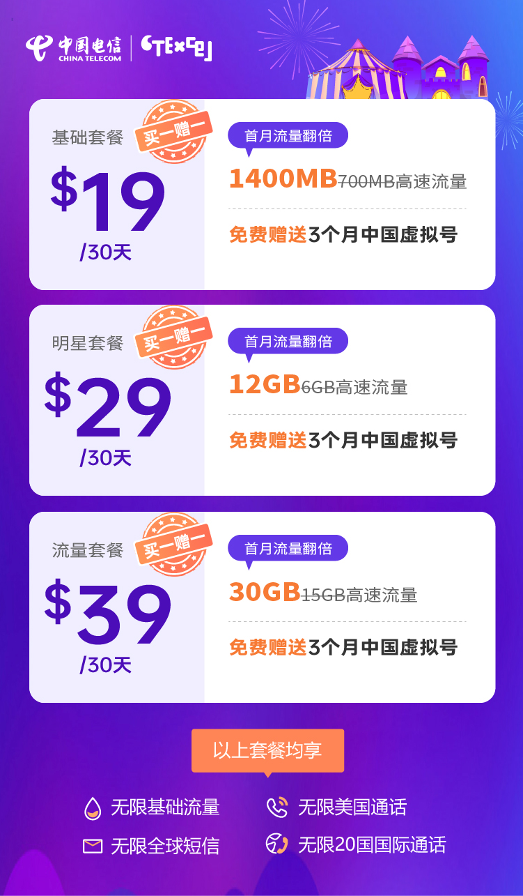 中国电信CTExel套餐均包含无限基础流量、无限全球短信、无限中美及美国境内通话时间……简直就是为在美的华人、留学生量身定制。