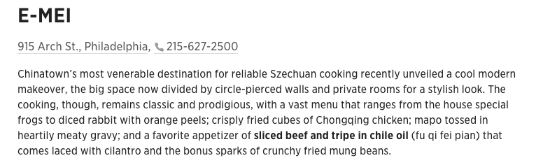 最具权威的《费城问询报》的美食编辑还将峨嵋录入到「费城美食指南」中。
