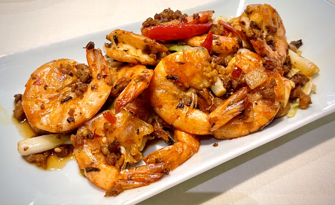 峨嵋只用几味简单私房调料就把这道鲜虾做得超乎想象的鲜美。成品大虾色泽红亮诱人,口味咸鲜鲜美,再配上脆脆的莲白,香辣的肉沫,好吃到吮指!