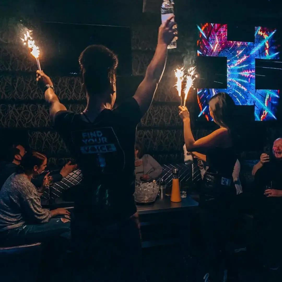 专业的音响和声控设备让人掉进了抛却烦恼的夜店之中,舞台上方是超过16英尺*8英尺的巨型屏幕,沉浸式的体验,让你甘愿把灵魂质押在这儿换取一夜酣畅。沉醉在嘻哈电音中尽情舞动,再邂逅一段浪漫疯狂的冒险,你来,故事就开始了。