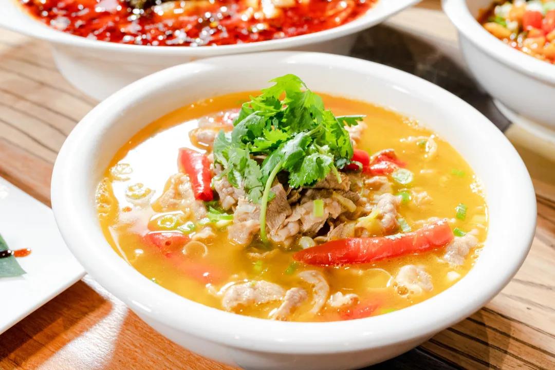 尤其推荐的是金汤肥牛,底下一般垫底的是金针菇和青笋丝,上面薄薄的肥牛片,浇上酸汤,撒点青红美人椒圈炸油上桌,汤汁是浓浓厚厚的金色。