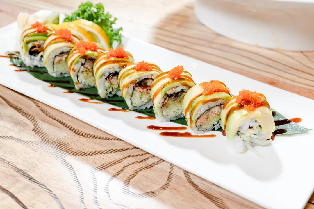 日料也非常不错,这款鳗鱼寿司卷上铺满新鲜牛油果和三文鱼籽,口感丰富绵密,鳗鱼烹制的恰到好处,入口即化,味道鲜美回味悠长。