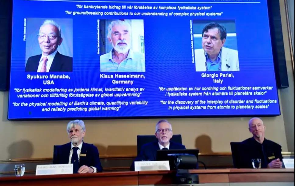 真锅淑郎(Syukuro Manabe)和克劳斯·哈塞尔曼(Klaus Hasselmann ),因其在“地球气候建模、量化气候变化以及对全球变暖的可靠预测”方面的贡献共同获奖。科学家乔治·帕里西(Giorgio Parisi)则因为他“在从原子到行星尺度的物理系统中无序和波动的相互作用方面的发现”的研究成果也分享了今年奖项。