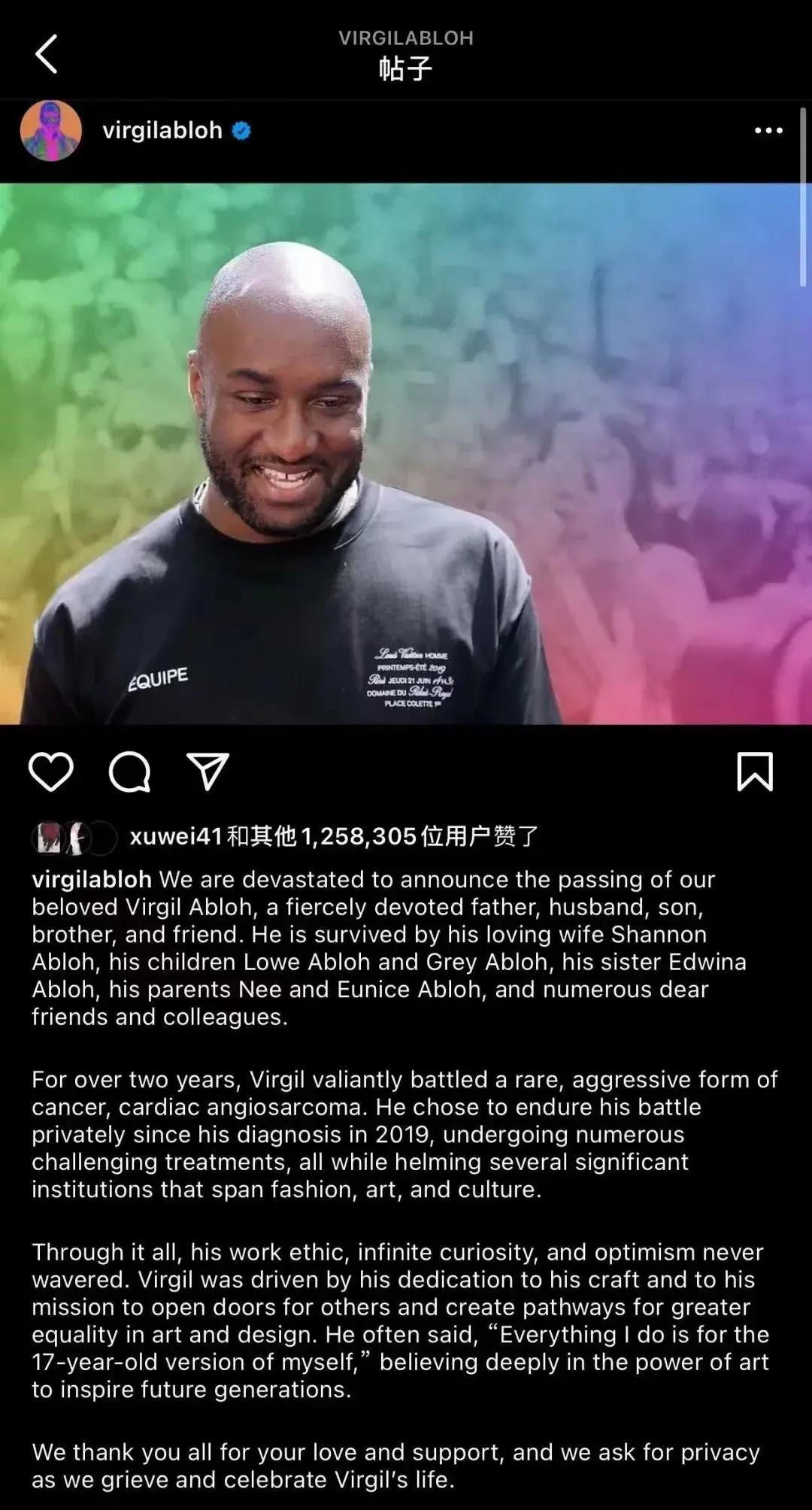 官方ins声明写到“两年多来,Virgil一直勇敢地和心脏血管肉瘤这种罕见的侵袭性癌症作斗争,自2019年确诊以来,他经历了无数次极具挑战性的治疗,同时还领导着公司在时尚、艺术和文化方面的工作。”
