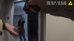 现场视频显示,最初,几名警察持枪在女子家门口“严阵以待”,还有一名警察在走廊上牵着一只警犬,屋内传出了女子的争执声,警犬凶狠狂吠。不久,随着争吵声越来越大,屋内传出了枪响,走廊上的警察带着警犬进入屋内,此时可以看到,有至少2名警察正向女子所在的房间鸣枪警告。