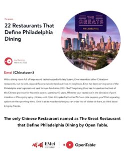 同大牌餐厅Parc, Zahav, Amada, Morimoto等一起入选的还有唐人街峨嵋山庄。它也是唯一一家入选此榜单的中餐厅。