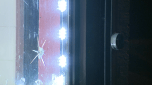 在枪击事件中,有两颗子弹从一扇敞开的前门和一扇窗户射进了中餐外卖店,窗户上的弹孔清晰可见。